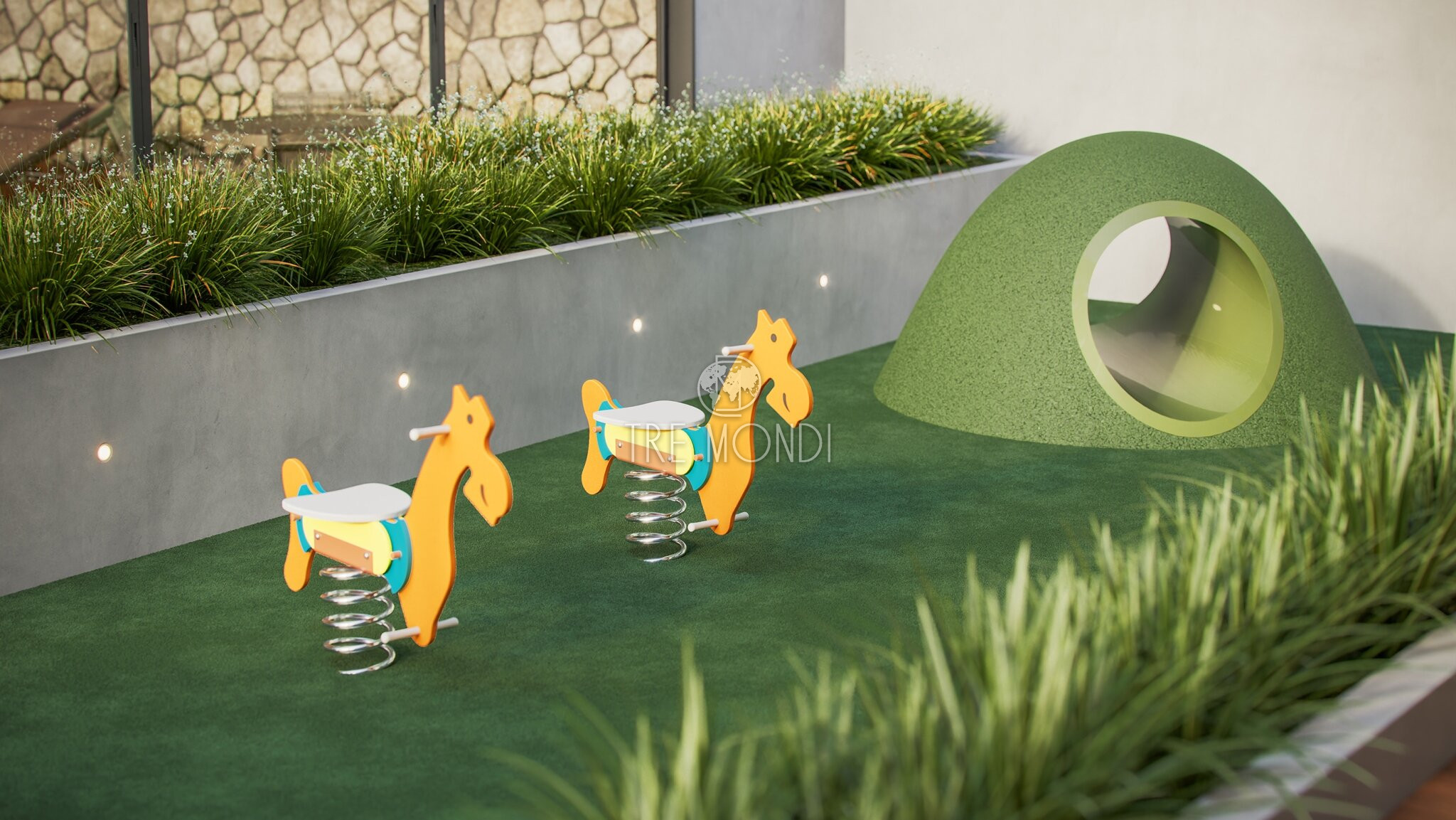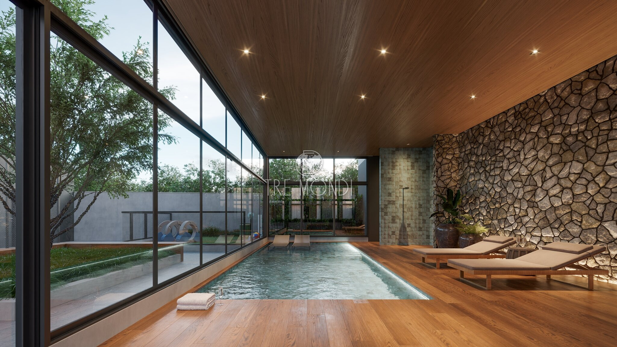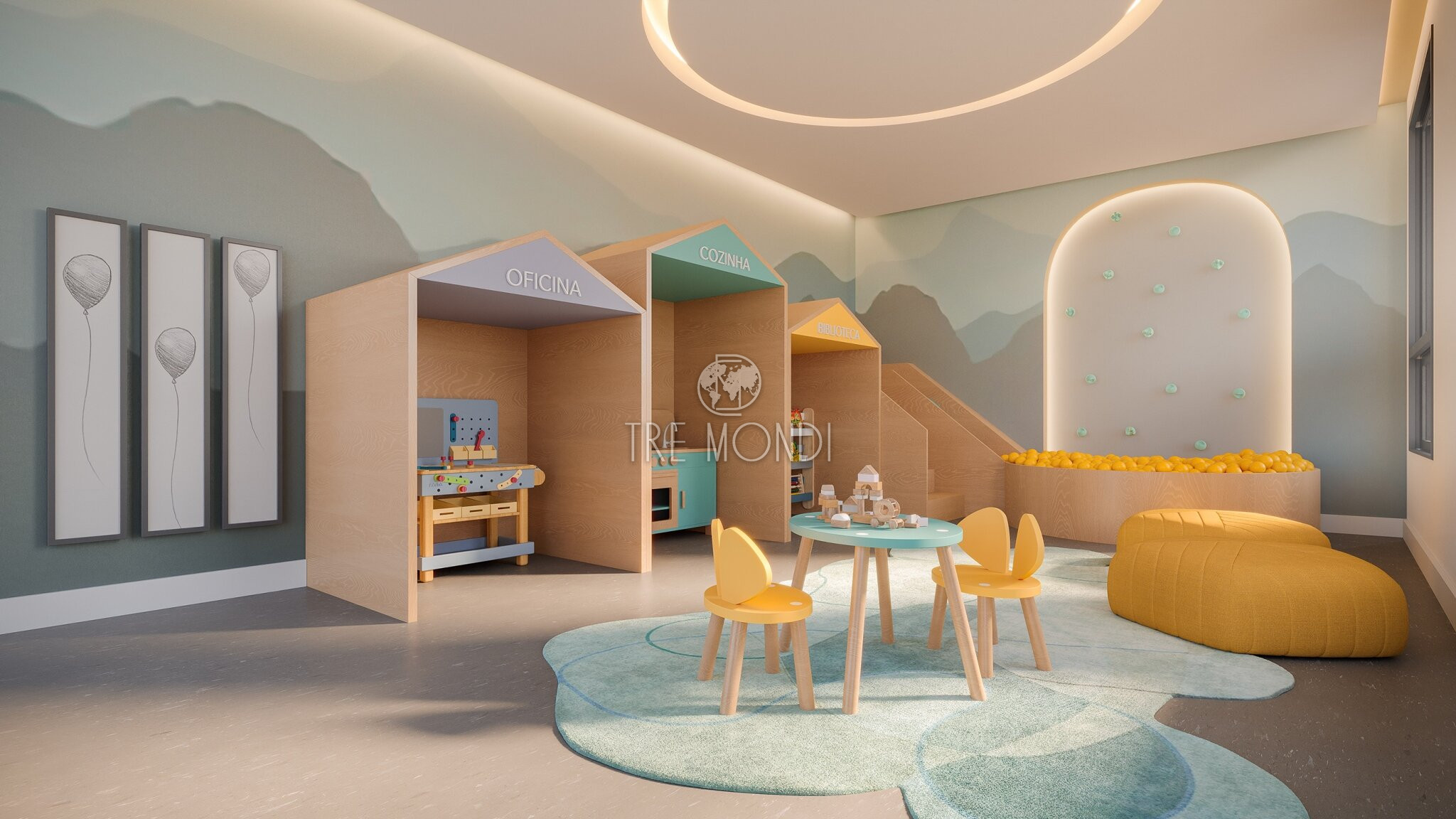 Port-cochère, Hall de entrada, Central de entregas e delivery, Praça central, Sala de reuniões, Espaço relax, Brinquedoteca, Academia, Salão de festas, Lounge externo, Playground, Espaço pet, Quadra de beach, Piscina coberta, Bicicletário com oficina, Gerador de emergência, Sistema de segurança entregue instalado, Eclusa de pedestres, serviço e veículos, Vestiário e copa para funcionários, Carregador para carro elétrico, Vagas para visitantes.
