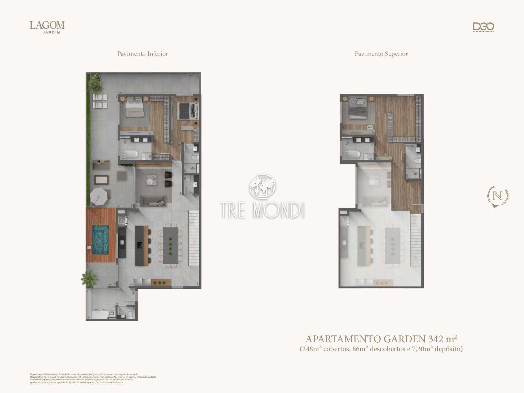 248m² de apartamento + 86m² de jardim externo + 7,30m² de depósito = 342m² privativos