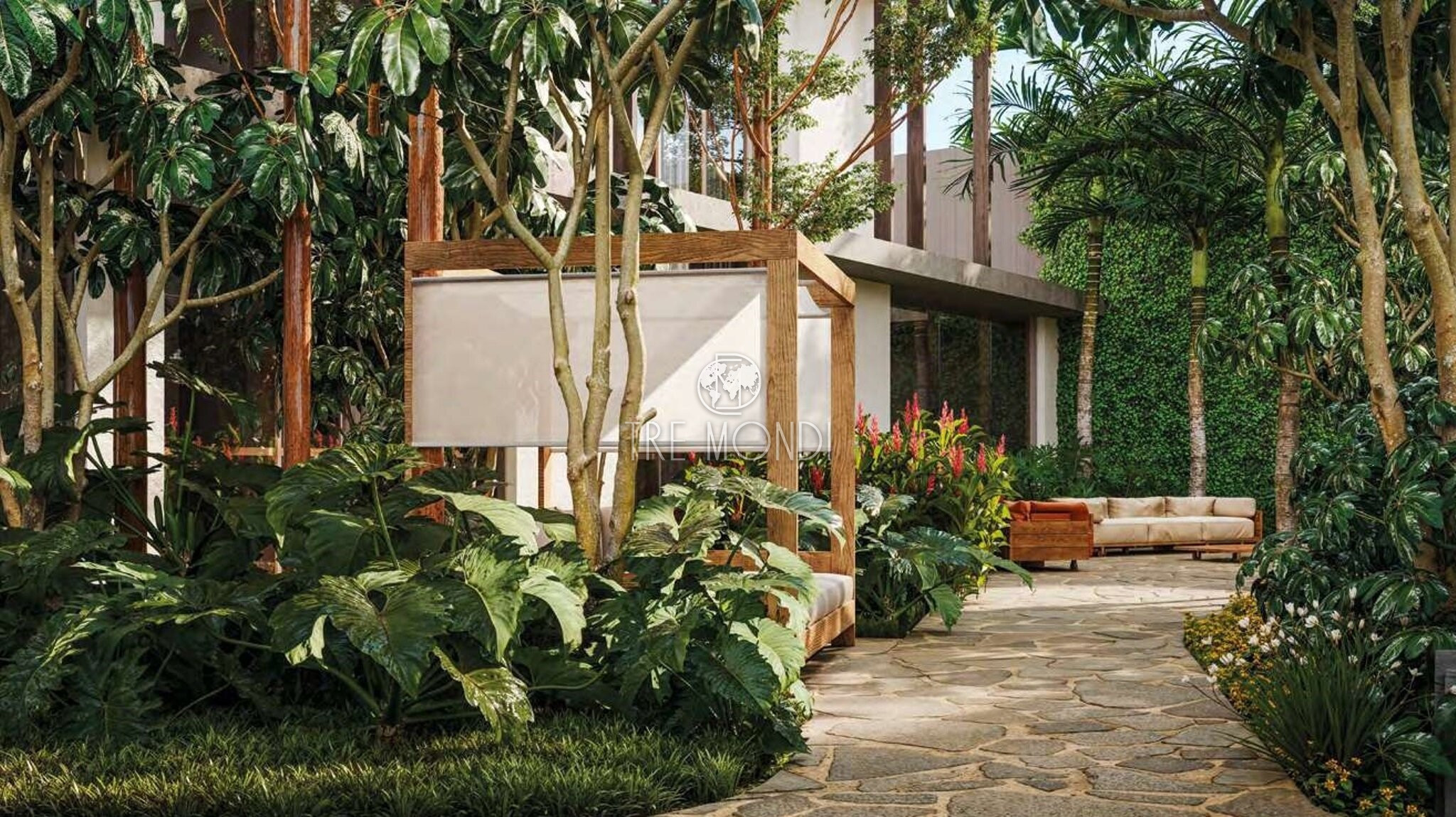 Amplo jardim externo privativo com piscina