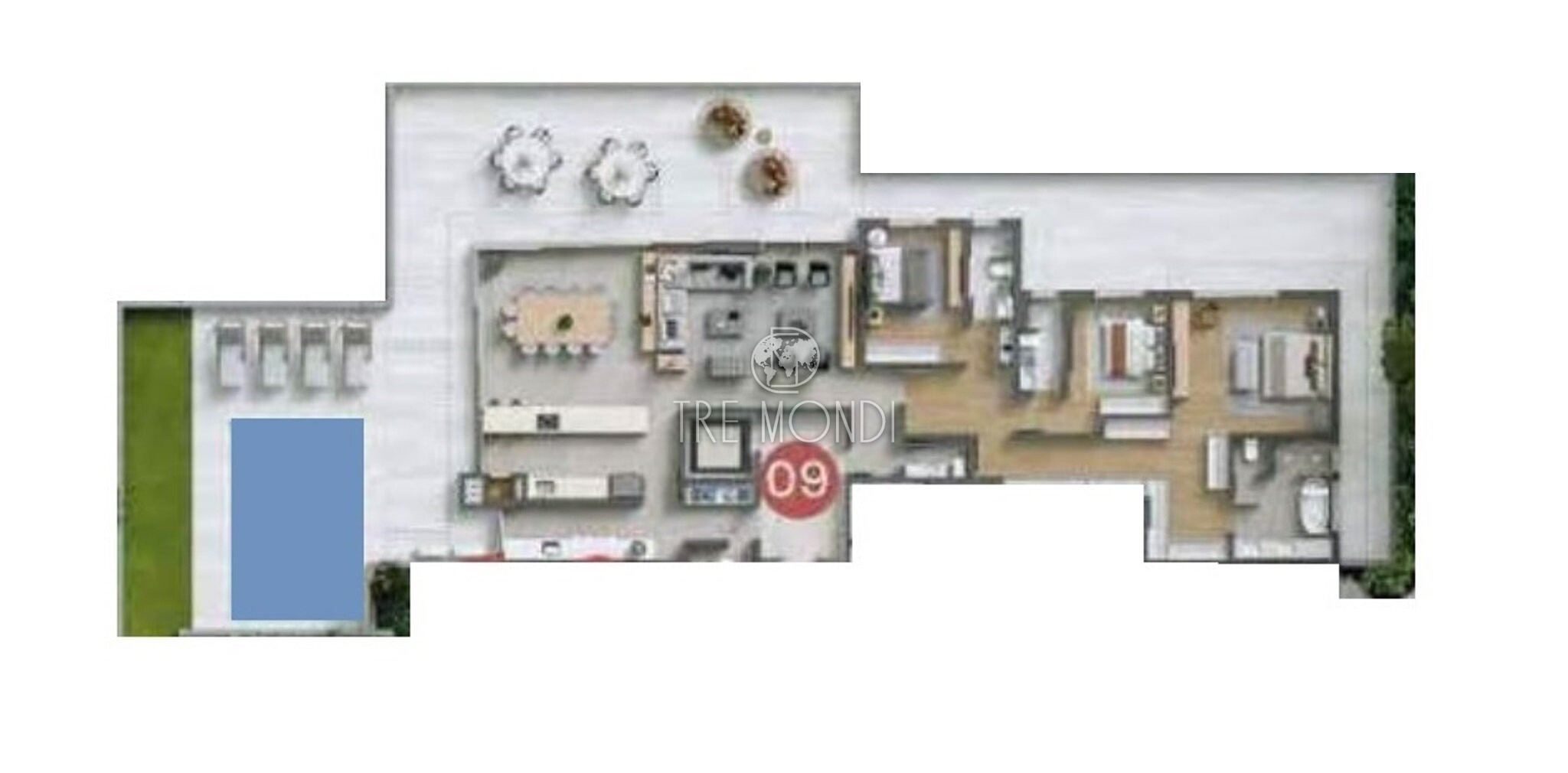 206,50 de apartamento + 126,39m² de jardim externo = 332,89m² privativos