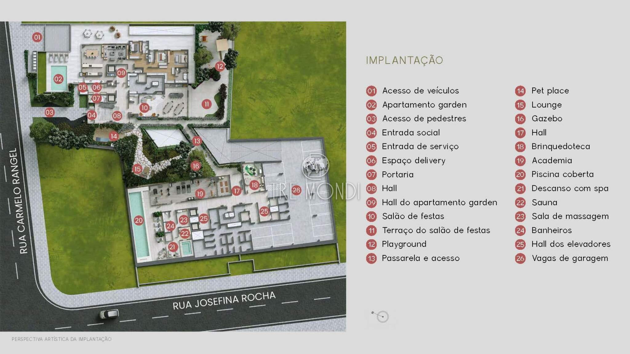 Portaria, Hall de entrada, Central de entregas e delivery, Salão de festas, Lounge externo, Gazebo, Piscina coberta, Fireplace, Espaço health, Sauna, Jacuzzi, Sala de massagem, SPA, Academia, Espaço pet, Playground, Brinquedoteca.