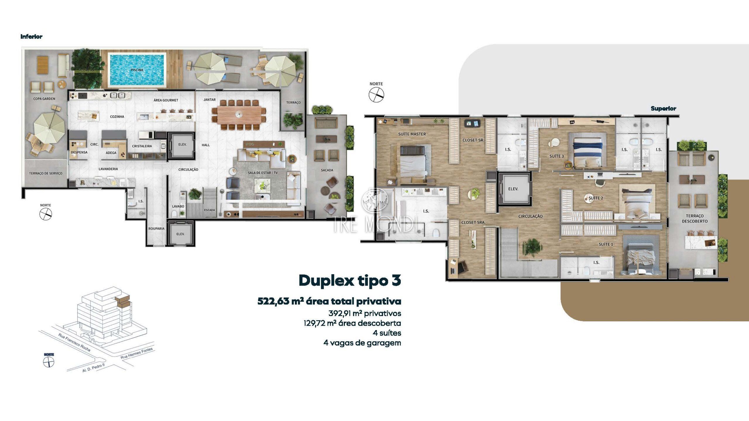 392,91m² de apartamento + 129,72m² de jardim exclusivo = 522,63m² privativos