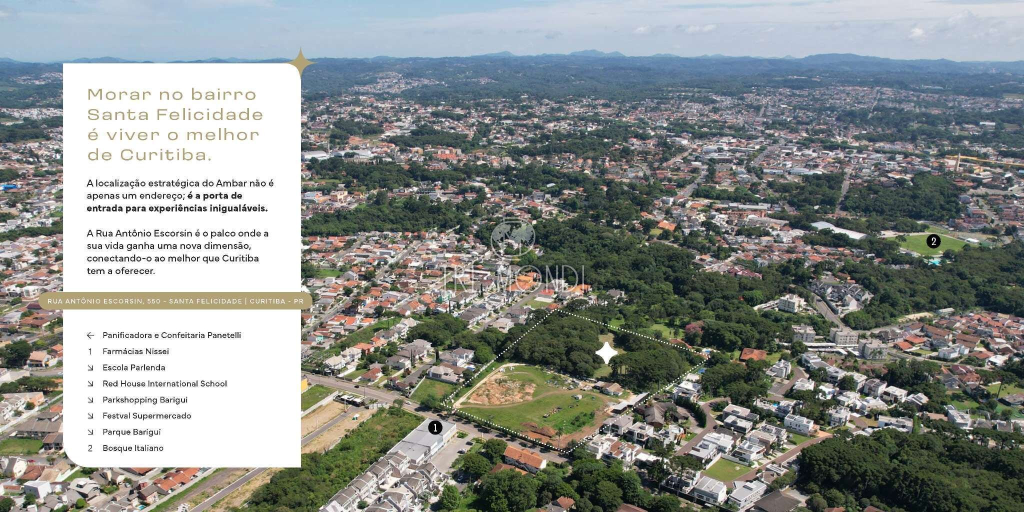 Na melhor localização do bairro de Santa Felicidade, surge um empreendimento que vai além de paredes e estruturas. O Ambar não é apenas um espaço; é uma promessa de vida, onde cada detalhe é uma expressão da simplicidade elevada à sua forma mais sublime. A localização estratégica do Ambar não é apenas um endereço; é a porta de entrada para experiências inigualáveis. A Rua Antônio Escorsin é o palco onde a sua vida ganha uma nova dimensão, conectando-o ao melhor que Curitiba tem a oferecer.